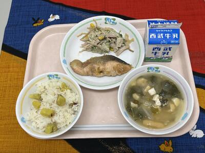 【きょうの給食】10月8日(水) 投稿: 松井小承認者 (14:11) ・さつま芋ごはん ・さけの香味焼き ・ごぼうレンコンサラダ ・大根のみそ汁 ・牛乳 今日は、甘くてほくほくのさつま芋をご飯に入れました。 甘いさつま芋とちょっぴり塩気のあるごはんとの相性が抜群です。 ご家庭でも作ってみてください。