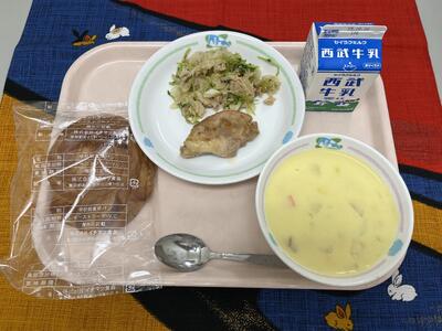 【きょうの給食】10月10日(金) 投稿: 松井小承認者 (13:26) ・デニッシュブルーベリー ・鶏肉のマーマレード焼き ・豆苗ツナサラダ ・コーンチャウダー ・牛乳 今日は「目の愛護デー」です。目の疲労回復に効果があるというブルーベリーを練りこんだ デニッシュパンにしました。この機会に目を労わってあげましょう。