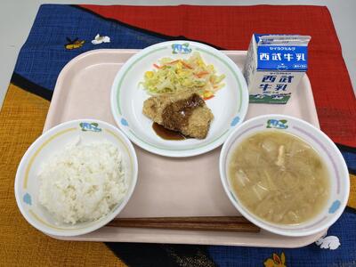 【きょうの給食】12月9日(火) 投稿: 松井小承認者 (12/09) ・ごはん ・アジフライ ・コールスローサラダ ・大根と白菜のみそ汁 ・牛乳 今日はアジフライです。青背の魚は脳の働きを良くしたり、血液もサラサラにしてくれます。 ビタミンDも多く含まれるので、骨の健康も守ります。残さず食べてほしいですね。