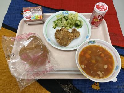 【きょうの給食】12月23日(金) 投稿: 松井小承認者 (13:46) ・フラワーロールパン ・鶏肉のガーリック揚げ ・ブロッコリーサラダ ・ミネストローネスープ ・クリスマスチョコレートケーキ ・飲むヨーグルト 今日で2学期最後の給食です。クリスマスイブイブですが、クリスマス献立にしました。 ケーキに大喜びしている子供たちの姿がとても微笑ましかったです。 スープには、星形のパスタを入れました。「クリスマス」感じてくれたでしょうか?