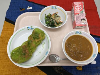 【きょうの給食】1月21日(水) 投稿: 松井小承認者 (13:37) ・まっちゃ揚げパン ・こまツナサラダ ・ビーフシチュー ・セレクト飲み物(コーヒーミルク・りんごジュース・いちごミルク・お茶) 今日は、飲み物をセレクト給食にしました。いちごミルクは始めての登場です。 人気第1位の揚げパンは、うぐいすきなこに埼玉県産の抹茶を混ぜ、砂糖を入れて 甘くしたものを揚げパンに絡めました。みんな楽しそうに食べていました。