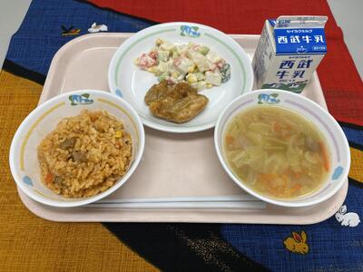 【きょうの給食】2月4日(水) 投稿: 松井小承認者 (13:29) ・メキシカンピラフ ・タンドリーチキン ・ポテトサラダ ・ABCスープ ・牛乳 インフルエンザが流行しています。ウイルスに負けない体力づくりが大切!そのために 大事なのが、毎日の給食です。野菜に多いビタミン、魚や肉・大豆に多いたんぱく質、 ごはんやパンのエネルギー源がそろうことで体の中の免疫力がしっかり働きます。 好き嫌いせずしっかり食べて元気に冬を乗り切りましょう。
