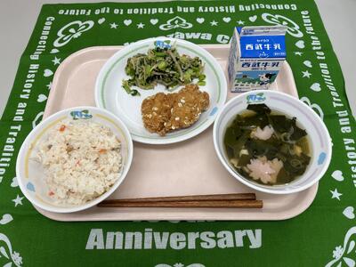 【きょうの給食】4月10日(月) 投稿: 松井小承認者 (13:34) ・さけごはん ・鶏肉のひばり揚げ ・磯和え ・すまし汁 ・牛乳 今日から新年度の給食が始まりました。「今日の給食もおいしかったよ」の声をたくさん 聞けるよう、心をこめて安心・安全な給食づくりに努めてまいります。よろしくお願いいたします。