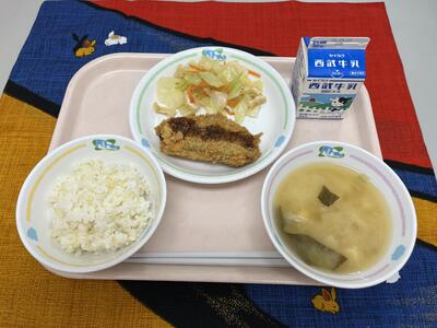 【きょうの給食】4月13日(月) 投稿: 松井小承認者 (13:50) ・きびごはん ・アジフライ ・キャベツと油揚げのおひたし ・じゃが芋のみそ汁 ・牛乳 今日は、白米にもちきびを混ぜて炊いたごはんです。ちょっともっちりしておいしいです。 もちきびは白米に比べて、食物繊維や鉄分、ビタミンB群も豊富です。ご家庭でもぜひ、 食べてみてください。
